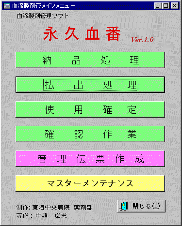 用意されています。 商品登録:平成9年8月現在の該当商品がすでに入力されています。その一覧に採用チェックをし、ユ ニークコードとしてCODE、入力CODE、各画面におけるリストの順序を設定する整列番号を設定します。 マスターにない商品は新規登録を行ってください。商品データ再構築ボタンを押すことで、病院用商品名マスタが作成されます。変更を行ったときも商品デ ータ再構築ボタンを押してください。現在のプログラムでは、商品名マスタの商品名を検索キーに使用しているため商品名の一部を半角から全 角などといったような些細な変更をしても同一商品として検索ができなくなります。将来的にCODEで検索 するようにするため、必ず初期導入時から、CODEは登録しておいてください。 払出部門登録:商品名登録と同様に払出部署を設定します。書換えボタンを押すことで各画面のリストボ ックスに反映されます。 患者登録:患者データを入力します。1患者ずつ個々に入力が可能ですが、区切り文字として半角ダブル クォーテーション " で区切ったファイル(K3と呼ばれるフォーマット)での一括登録が可能です。 同様に追加・修正データとしてK3ファイルを作成することで、IDデータの追加・更新をするよう準備を進めています。 |