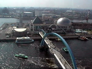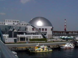 名古屋港内に大きな銀色半球の建物がめだつ。横にはきれいな白い海洋博物館がそびえ,南極観測船「ふじ」が接岸しています。